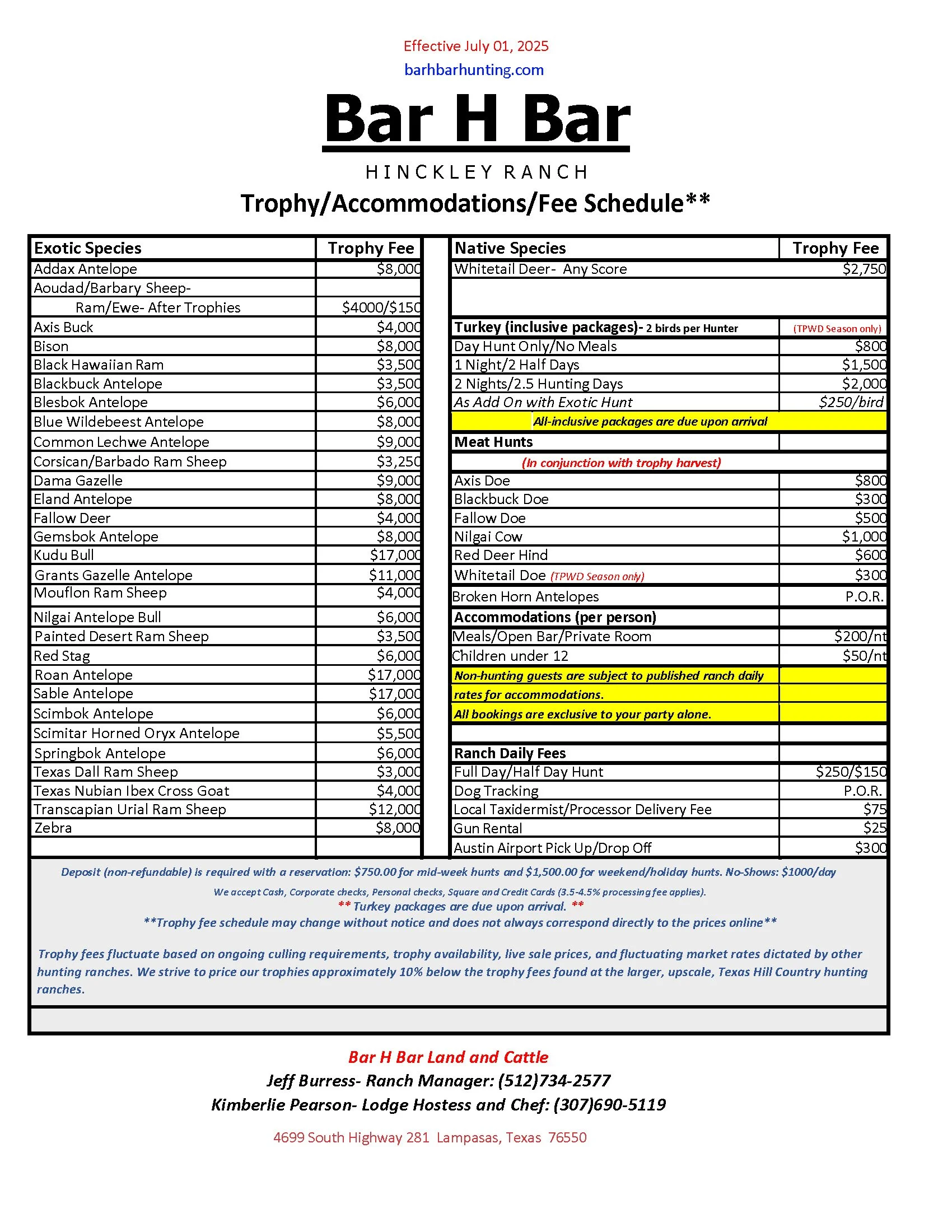 The trophy fees in the document below can fluctuate (please refer to current price list with -H- Lodge manager when booking your hunt) and do not include lodging, guide fees, gun rental, or transportation, incidentals and are subject to change without notice. In case of cancellation, your deposit will not be returned.